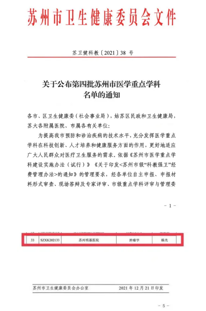 2021年12月21日,苏州卫生健康委员会发布苏卫健科教[2021]38号文件——《关于公布第四批“苏州市医学重点学科”名单的通知》,苏州明基医院肿瘤中心被评为“肿瘤学”苏州市医学重点学科。