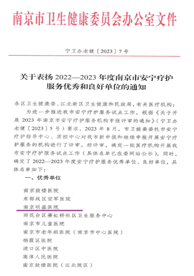 截至到2023年9月,南京市开展安宁疗护服务试点的医疗机构已达62个,“2022-2023年度安宁疗护服务优秀单位”这份荣誉既是充分肯定了南京明基医院安宁疗护工作取得的成绩。同时也激励着我院继续发扬成绩、再接再厉,进一步强化政策倾斜、加强人才培养、深化内涵建设、注重质量控制,不断提升安宁疗护服务能力和服务水平的,推动我市安宁疗护工作取得新的进展。