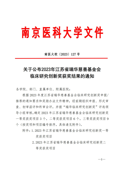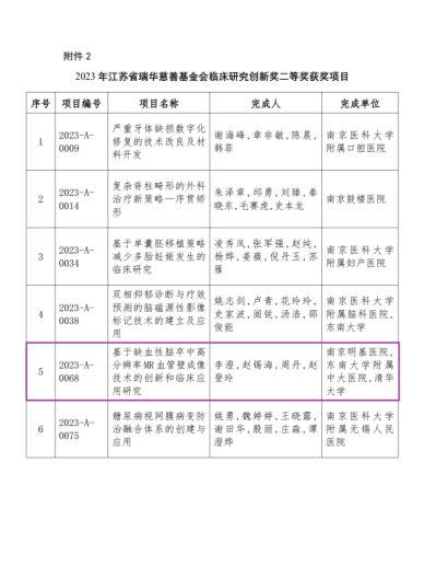 日前,在南京医科大学发布的《关于公布2023年江苏省瑞华慈善基金会临床研究创新奖获奖结果的通知》中,我院放射科李澄教授团队创新项目“基于缺血性脑卒中高分辨率MR血管壁成像技术的创新和临床应用研究"获得了二等奖,这是我院在江苏省瑞华医学奖奖项新的突破!“江苏省瑞华慈善基金会临床研究创新奖"是由江苏省瑞华慈善基金会(以下简称“瑞华慈善基金会")设立的奖项,主要奖励具有突出贡献的创新性临床研究成果,由瑞华慈善基金会授权委托南京医科大学组织实施。每年吸引了省内众多的医学研究专家踊跃申报。